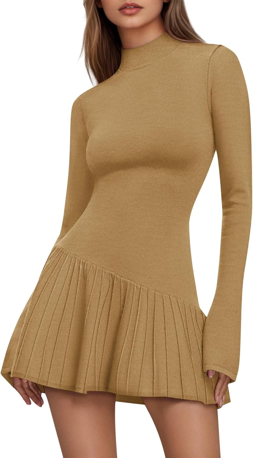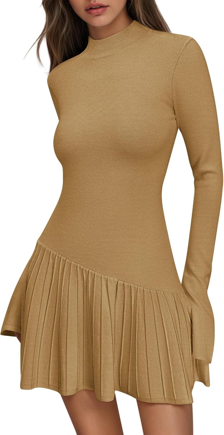 Women’s Sweater Dress Crochet Ribbed Knit Ruffle Hem Flared Long Sleeve Mock Neck Mini Dress